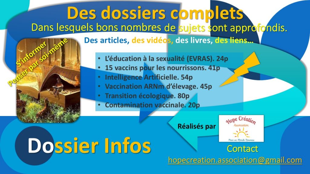 Association Hope Création Nos Dossiers Infos S’informer et penser par soi-même ! Découvrez les flyers de présentation de tous nos dossiers. Vous pouvez commander le ou les dossiers de votre choix, gratuitement par mail. Education à la sexualité : le massacre des innocents ! Le flyer recto-verso ci-dessous. Un dossier de 24 pages vous sera … Lire la suite de Présentation Dossiers Infos & Flyers